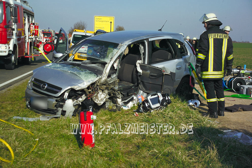 Zwei Schwerletzte und 170.000 Euro Schaden waren die Bilanz eines Verkehrsunfalles am Dienstagnachmittag auf der B 272 in Höhe Weingarten. Ein 73-jähriger Fahrzeuglenker befuhr die B272 aus Richtung Landau in Richtung Speyer, zwischen den Anschlussstellen Lustadt und Weingarten geriet er aus bislang unbekannter Ursache auf die Gegenfahrbahn. Ein entgegenkommender 49-jähriger Lkw-Fahrer versuchte noch einen Frontalzusammenstoß zu vermeiden. Hierbei kippte der Lkw um und verlor den geladenen Mutterboden. Der 73-Jährige musste durch die Freiwilligen Feuerwehren aus Lingenfeld, Schwegenheim, Lustadt und Freisbach mit schwerem Gerät aus seinem Fahrzeug befreit werden. Beide Fahrer wurden durch Rettungsdienste in umliegende Krankenhäuser verbracht. Die B272 musste zur Bergung der Fahrzeuge und Entfernung der Erde mehrere Stunden voll gesperrt werden.